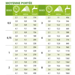Elle permet de couvrir une zone de 6,7 Ă 15 m de rayon pour une pression de 2,1 Ă 4,8 bars.